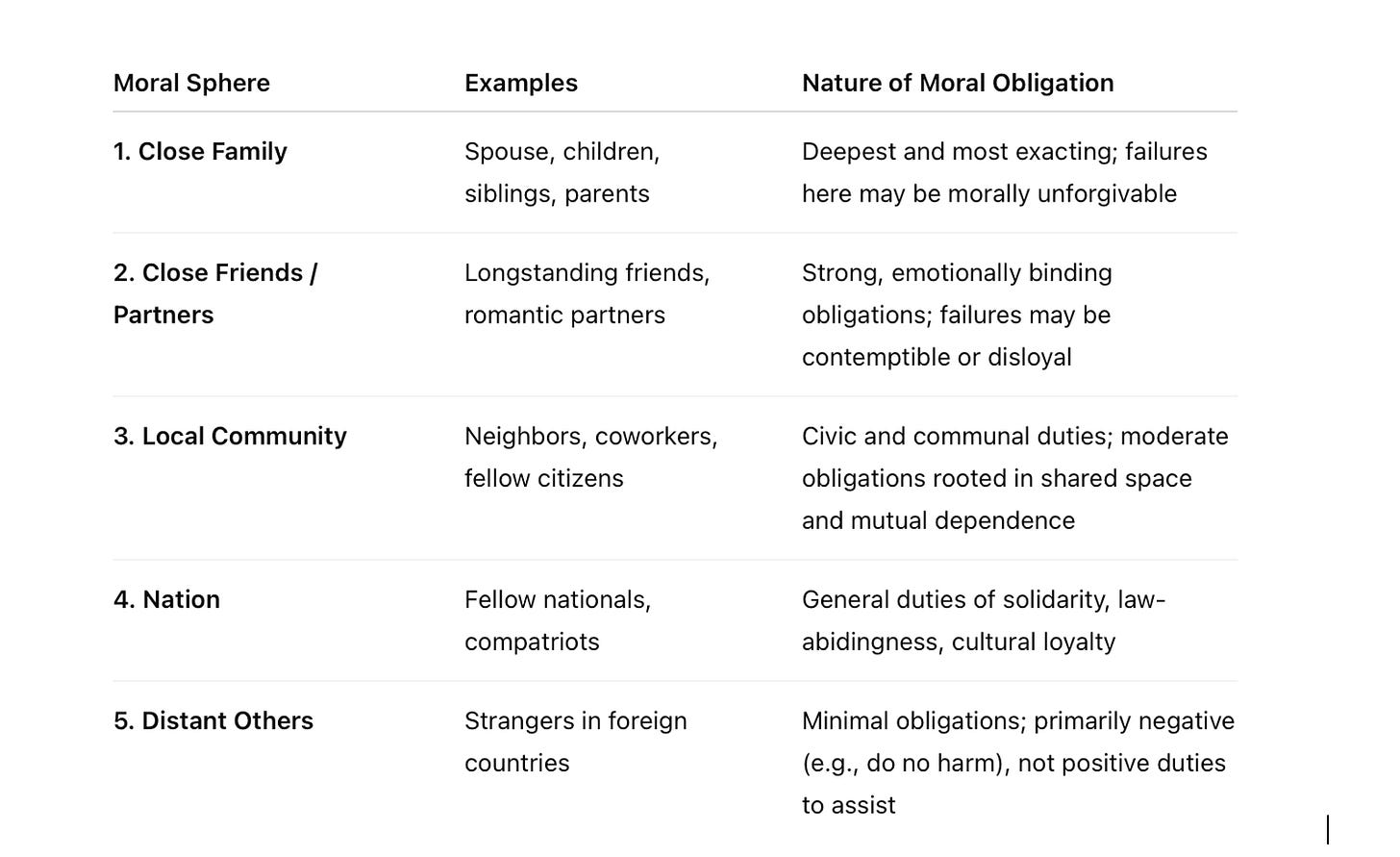 The second sphere includes close personal relationships, e.g., friends, partners, and long-standing companions. Our obligations here remain strong, though not as binding as those within the family. In the third sphere lies the local community, e.g., neighbors, colleagues, fellow citizens. The fourth encompasses the nation. Beyond that, our moral obligations become more faint and more abstract until they become nonexistent.