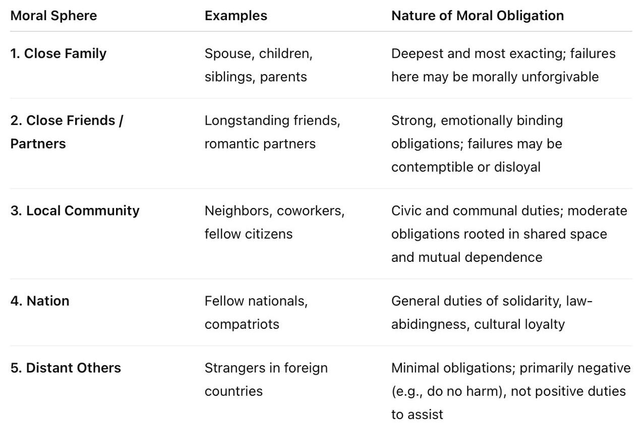 The second sphere includes close personal relationships, e.g., friends, partners, and long-standing companions. Our obligations here remain strong, though not as binding as those within the family. In the third sphere lies the local community, e.g., neighbors, colleagues, fellow citizens. The fourth encompasses the nation. Beyond that, our moral obligations become more faint and more abstract until they become nonexistent.