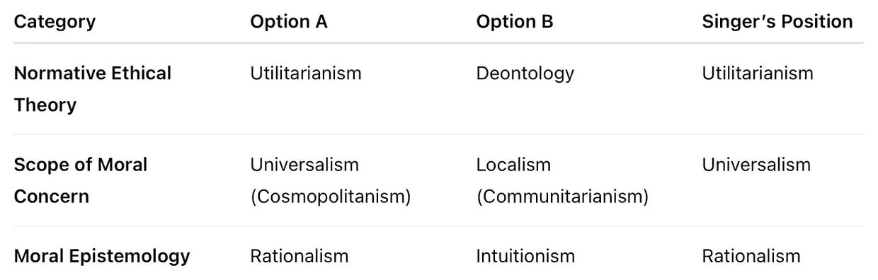 Although it has evolved, Singer’s basic philosophical framework remains largely intact from Practical Ethics. It is marked by three central commitments: (1) utilitarianism; (2) cosmopolitan; and (3) rationalism1. Unfortunately, none of these terms is straightforward. Thus, we must begin with provisional definitions whose full implications will only become clear by the end of this essay.