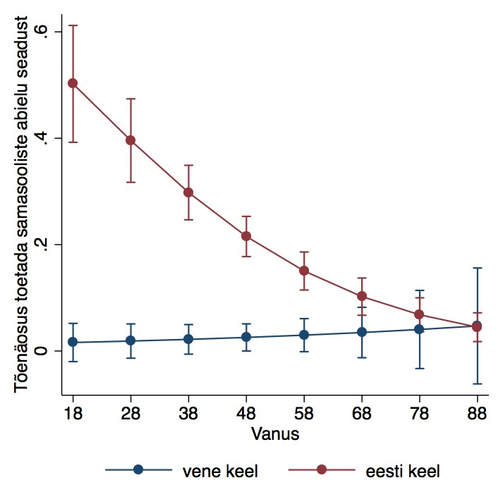 Younger generations of Estonian-speakers have been more exposed to American cultural messaging via the Estonian-language media. They thus have more liberal attitudes toward gay marriage. Older generations have been shaped much more by the media of Soviet times and are less liberal. No such generational difference exists within the minority of Russian-speakers, who continue to be influenced by media based in Russia (Karlin, 2018a).