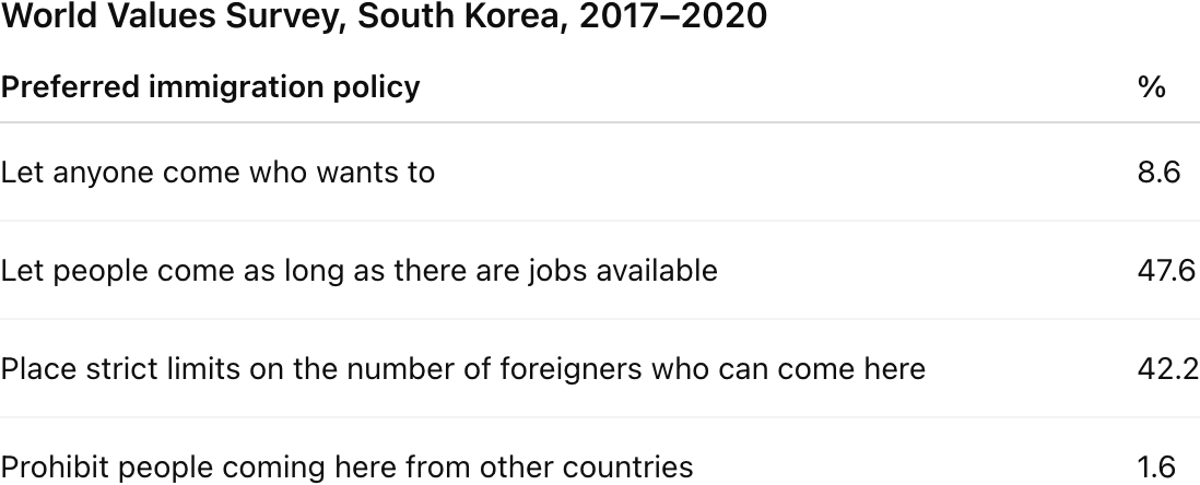 How then does the host society respond to immigration? With surprisingly little pushback. When 1,245 South Koreans were interviewed for the World Values Survey between 2017 and 2020, a slight majority said they favored a liberal immigration policy: