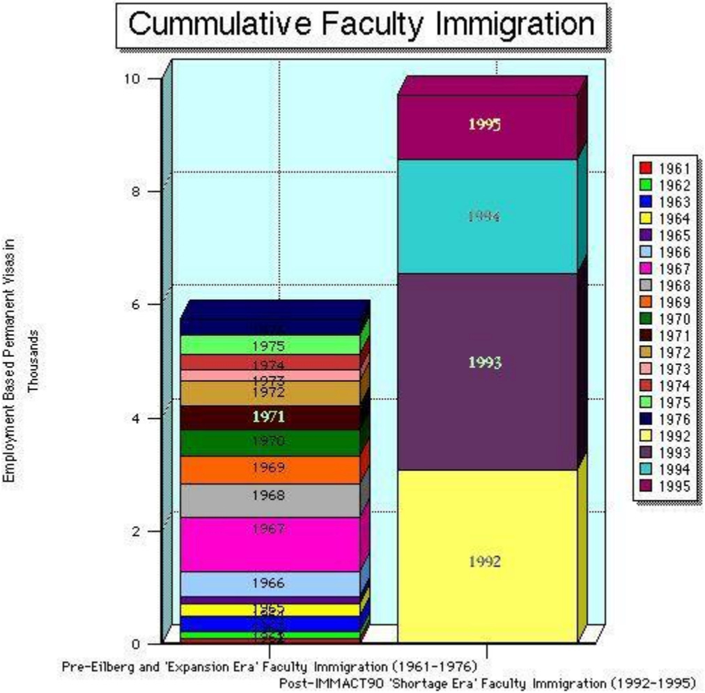 Modern US-style brain drain replacing the foreign experts model is much more recent than commonly understood. US STEM only became thoroughly de-Americanized after the end of the Cold War—for three reasons. First, spending on defence R&D, and with it the protected market guaranteeing a spot for native-born Americans who could be better trusted, was slashed as part of the “peace dividend.” With the Soviet Union gone, there were no plausible military threats to the United States.9 Second, there was a one-time influx of scientists from the former East Bloc, especially the USSR, which interrupted training and credentialing for American STEM scientists in the same fields, squeezing out American researchers. Third, the Immigration Act of 1990 created the H-1B visa.
