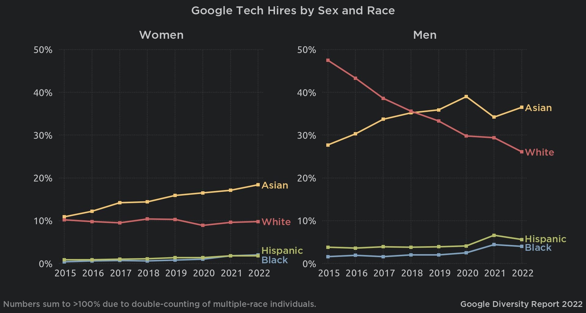 The trouble is, many of these positions require specific technical skills, and for reasons of both interest and ability, the domestic technical talent pool outside of white men is very thin.