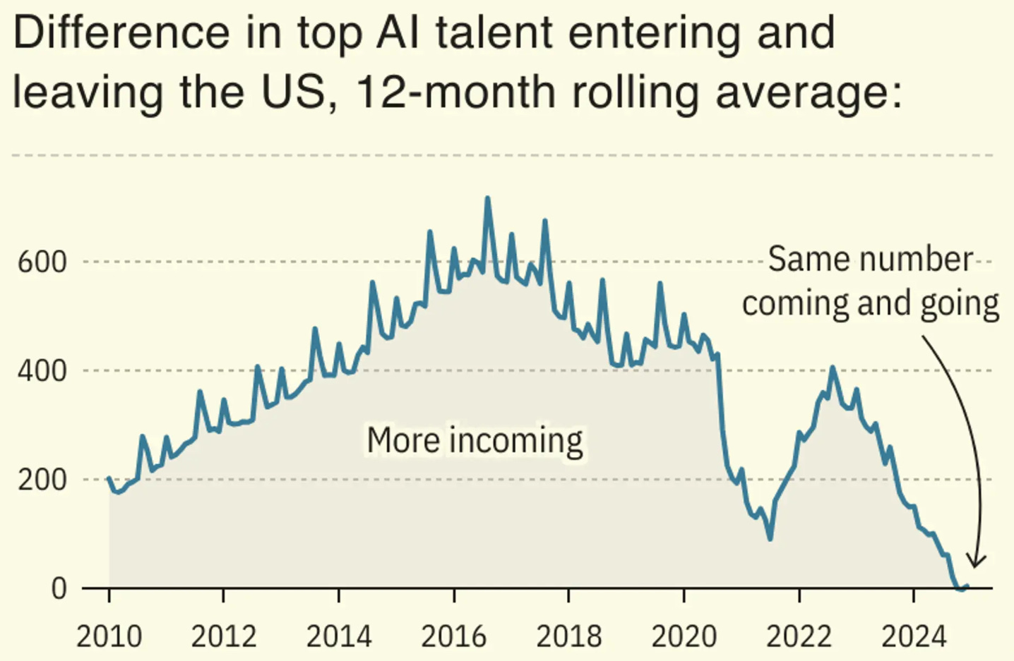 Modern brain drain to the US is not a strategic asset for the country; it is a liability. However, it could be turned into an asset by transitioning from the current “millions of mediocrities” model to a true foreign experts model of the kind that worked so well historically. For example, much writing on AI correctly points out how reliant the US industry is on foreign talent, with around 70% of high-end researchers being foreign born, and then condemns the Trump administration for hostility to immigration. But they typically fail to point out the tiny numbers involved.