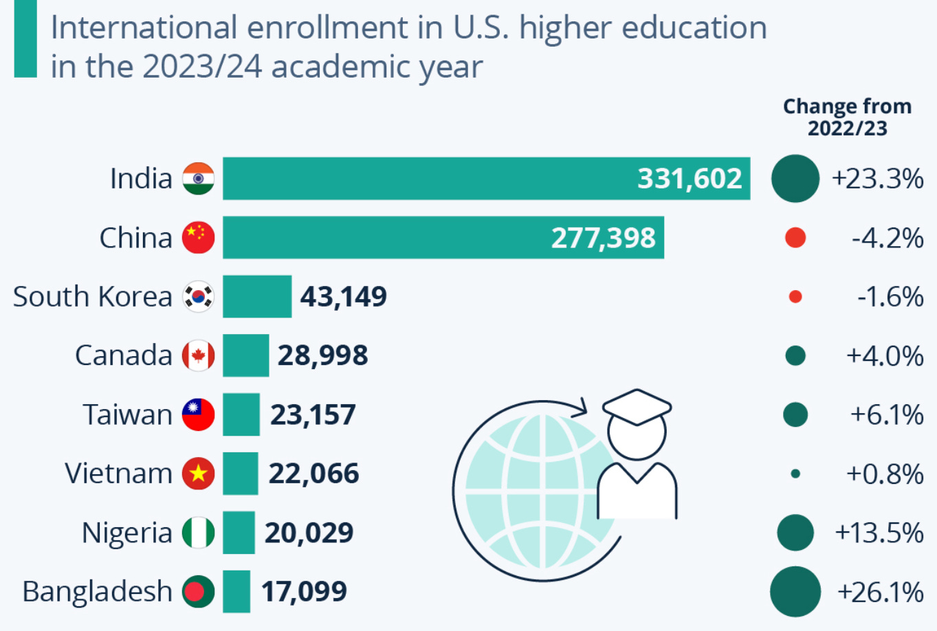 Rather than targeting small numbers of experts for their unique technical skills and presence in superior foreign industries, brain drain to the US today involves bringing in millions of marginally above-average people in the hope that a handful are loyal geniuses. The two major routes are student visas and skilled labor visas such as the H-1B. “America’s superpower” advocates typically want to massively expand both, with proposals such as ending country caps on employment-based green cards, and stapling a green card to every STEM diploma, being common. (Both of these proposals would primarily benefit Indian immigrants, who make up 62% of the green card backlog and 29% of foreign students—not counting secondary migration from Canada, Britain or the UAE).