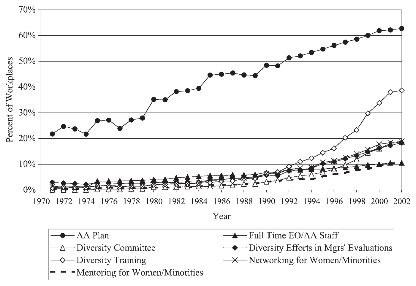 Some people are under the mistaken impression that affirmative action (“DEI”) is a recent phenomenon, especially outside of education. It is not. Chapters 4 and 5 of Jared Taylor’s Paved With Good Intentions, written in 1992, goes into the many forms this system has taken for generations, starting with Lyndon Johnson’s 1965 Executive Order 11246 demanding contractors take “affirmative action” to ensure nondiscrimination against protected categories. Since there are no hard criteria to establish discrimination, this has led to an arms race of different entities competing to give more and more privileges to people who aren’t white men.