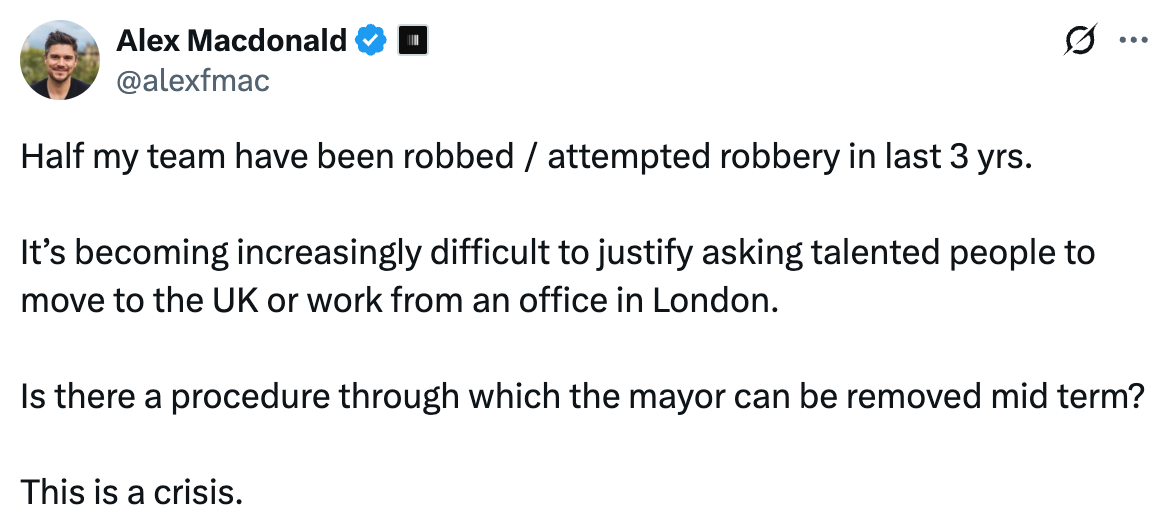 Consider how socially-housed foreign phone thieves and subway murderers make it harder, not easier, to attract the handful of European or Chinese AI experts who might otherwise want to live in London.
