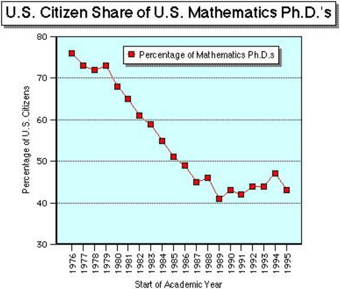During the Christmas 2024 H1-B argument on X, one statistic cited by H1-B proponents was that 43% of US STEM PhDs are foreign born. This should be a five-alarm-fire. A serious country with the national interest at heart would be doing whatever it took to improve the native-born and ethnic American STEM pool rather than pretend that ethnic Americans don’t exist.