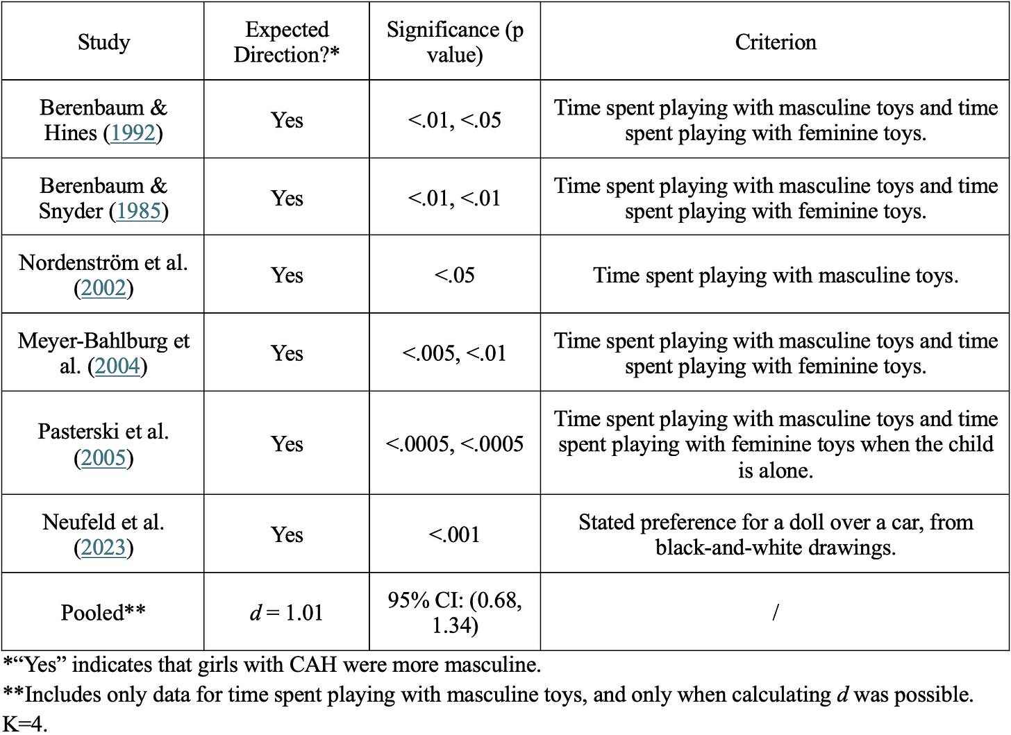The following table summarizes the results from the studies I was able to find comparing girls with CAH to controls on measures of toy preference, all of which found statistically significant effects in the expected direction (that is, CAH girls having more masculine toy preferences). The bottom row shows the result of a pooled analysis of four studies that used the same measure and provided enough information. The overall effect size, a d of just over 1, is huge, and explains how all of these studies were able to find statistically significant results despite having low sample sizes (typically about two dozen girls in each group).