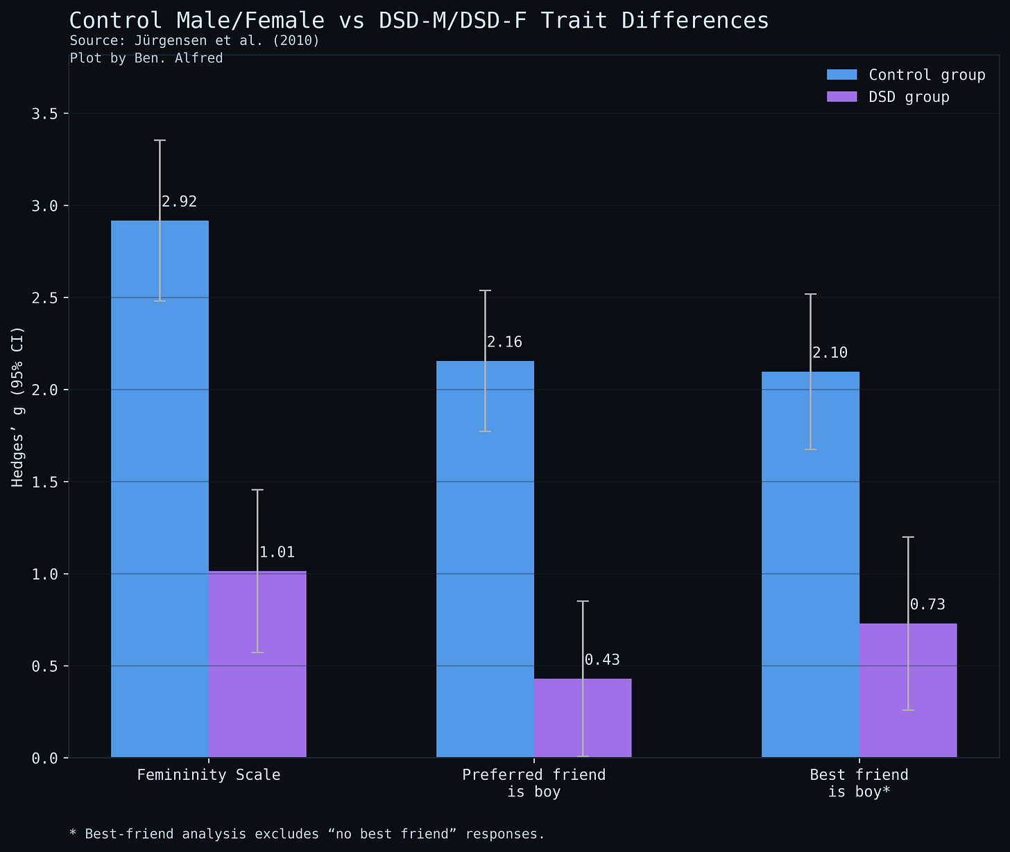 One such study was conducted by Jürgensen and colleagues (2010),2 based on a sample of 55 boys with DSD raised as males and 36 raised as females, as well as a control group of physiologically normal girls and boys. These groups were compared on a few measures: a femininity scale, the portion who would prefer a friend of a given sex, and the portion whose best friends are of a certain sex. The first measure is a shortened, German version of a popular scale called the CBAQ. The items are answered by the children’s parents and include, “He (she) plays with girl-type dolls such as baby or Barbie dolls” and “He (she) plays house”.3