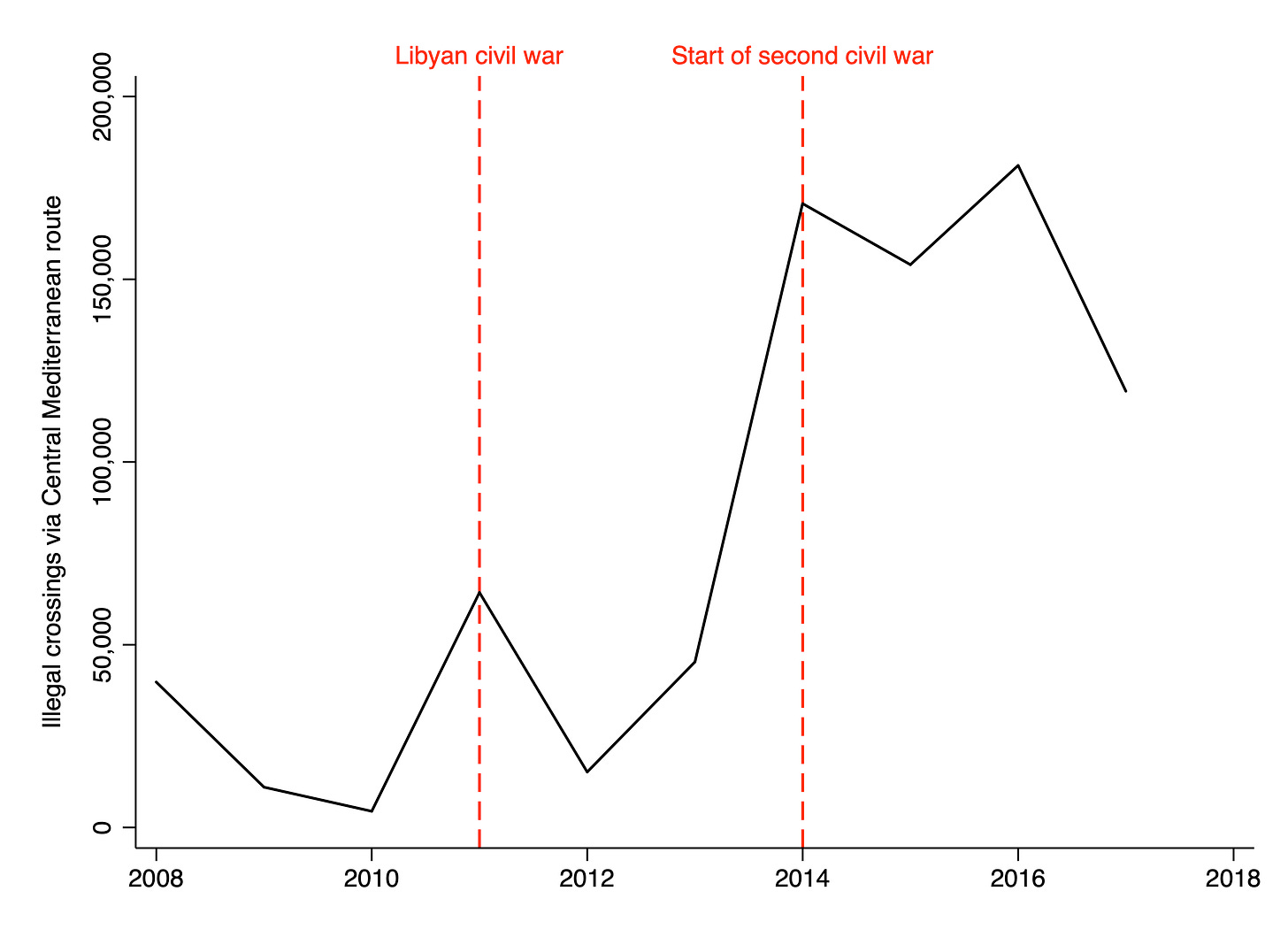 The next chart plots the number of illegal crossings into Europe via the Central Mediterranean route, which refers to the route from Libya to Italy. In 2008, Libyan leader Muammar Gaddafi signed a cooperation agreement with Italian Prime Minister Silvio Berlusconi, leading to a sharp fall in illegal crossings. Yet civil war broke out three years later, and Gaddafi’s government was toppled thanks to a US-led intervention on the side of the rebels. This ushered in a period of profound instability, including a second civil war, during which illegal crossings surged.3