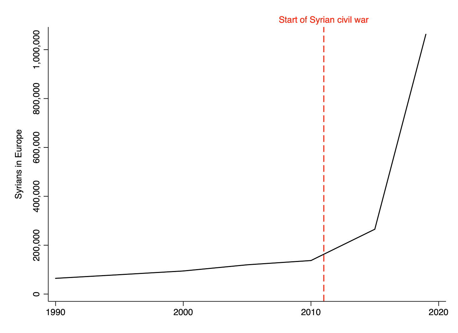 The chart below plots the number of Syrians in Europe from 1990 to 2019. It skyrocketed a few years after the start of the Syrian civil war, as the US began arming the rebels and the fighting grew more intense. Importantly, the million Syrians who went to Europe represent less than 20% of the refugees who fled Syria. The vast majority ended up in Turkey, Jordan, Iraq and Lebanon. Most of them are still there.