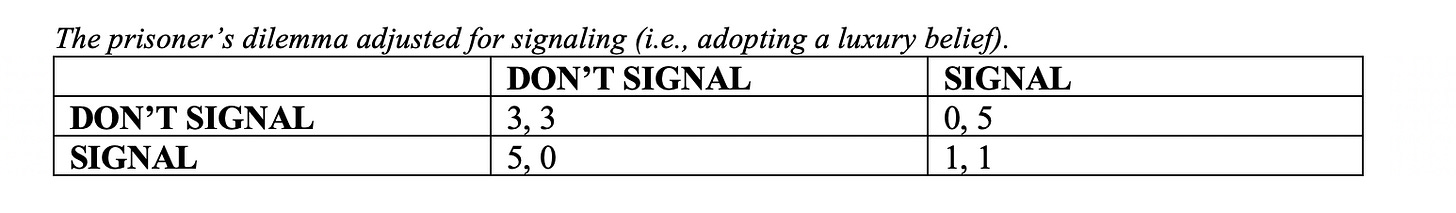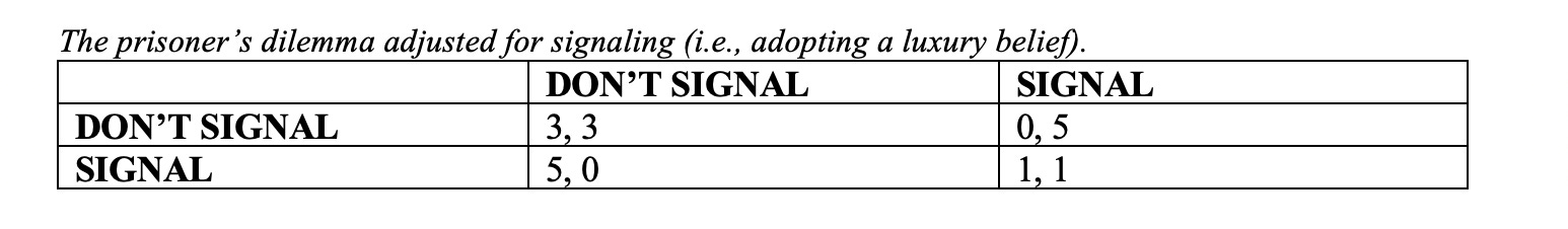 Although this proposal is not without merit and explanatory power, it does not support an analogy between luxury goods and luxury beliefs (as the luxury beliefs thesis requires). If an individual must choose between signaling to gain status while risking collective costs or refraining from signaling while also risking collective costs, signaling is the rational strategy.