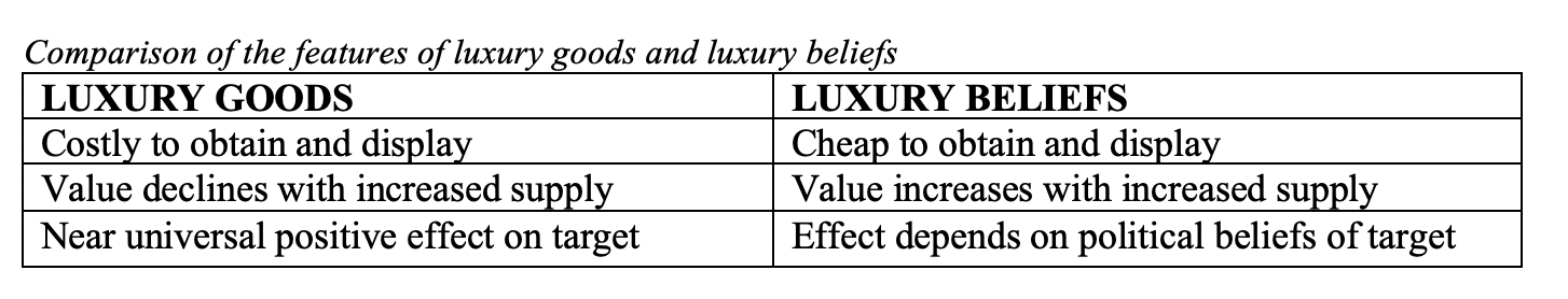 There are at least two other major differences between luxury beliefs and luxury goods. First, luxury good are positional whereas luxury beliefs are not obviously so and second, luxury goods confer status among most (perhaps all) groups of people whereas luxury beliefs do not.