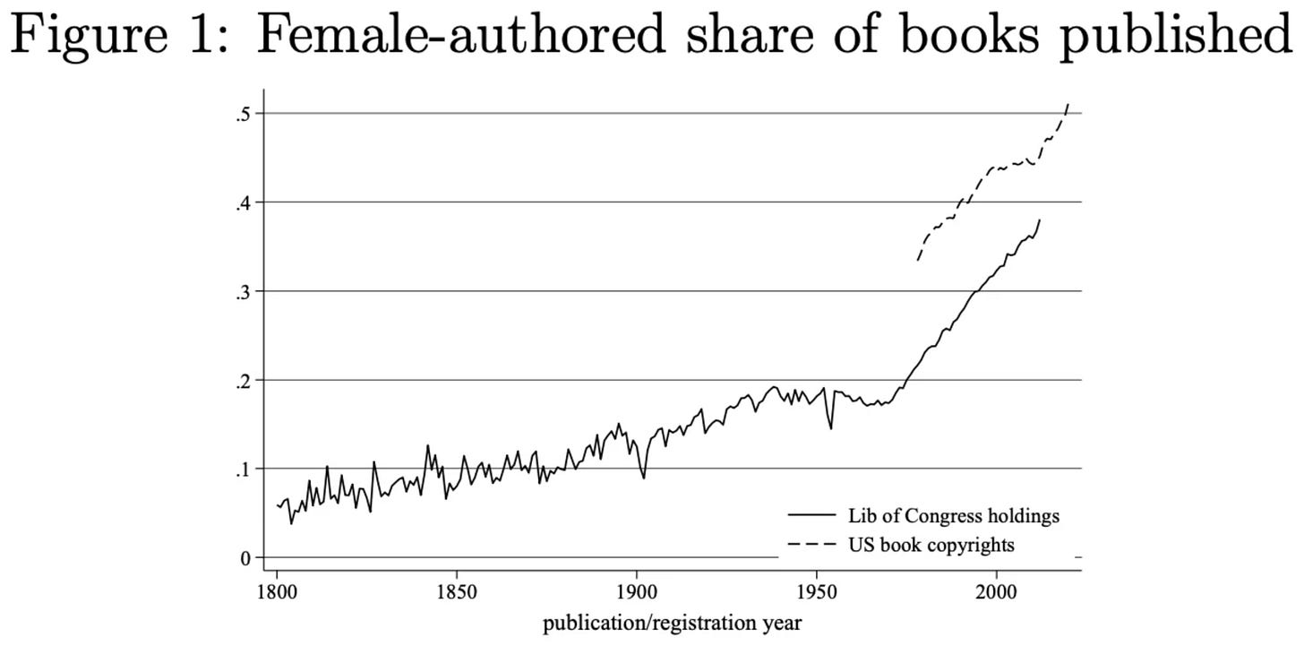 First, female-authored books crept upwards a share of the total between 1800 and 1970, before rocketing upwards, and are now a majority. (The publishing industry itself is 74% female.)