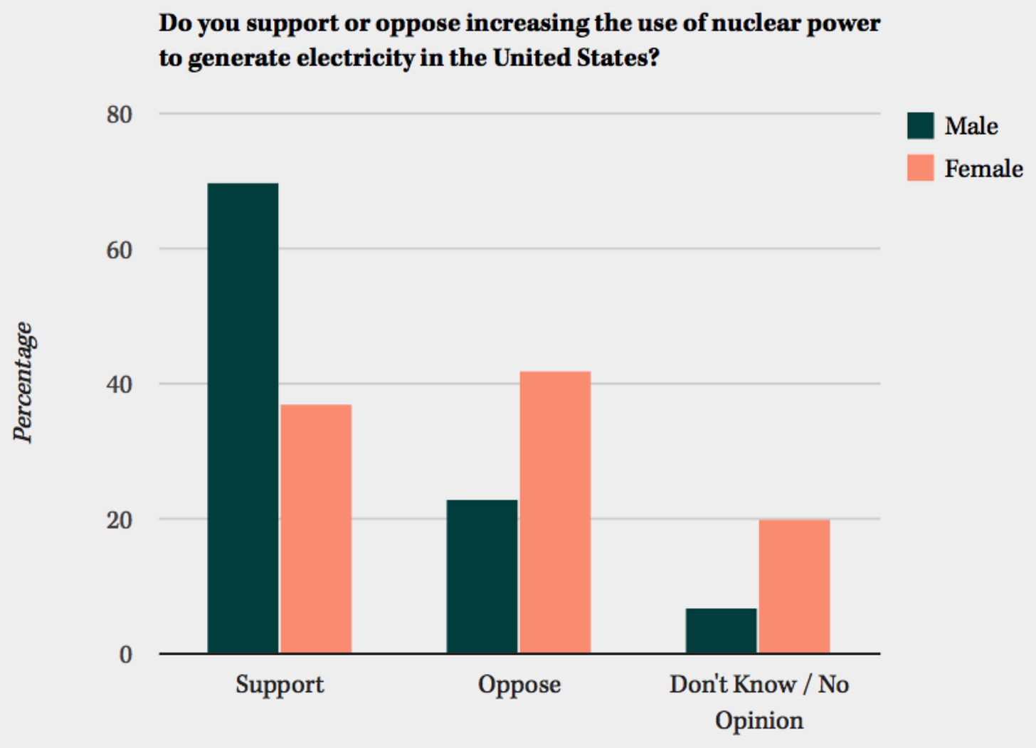 Nuclear power, which combines insignificant greenhouse gas emissions and air pollution with the reliability of fossil fuels, is another technology the progress movement strongly backs as a supplement to solar. There is a 30—point sex gap in support for increasing nuclear power generation in the US, and being male is one of the strongest predictors of support for nuclear in Denmark.