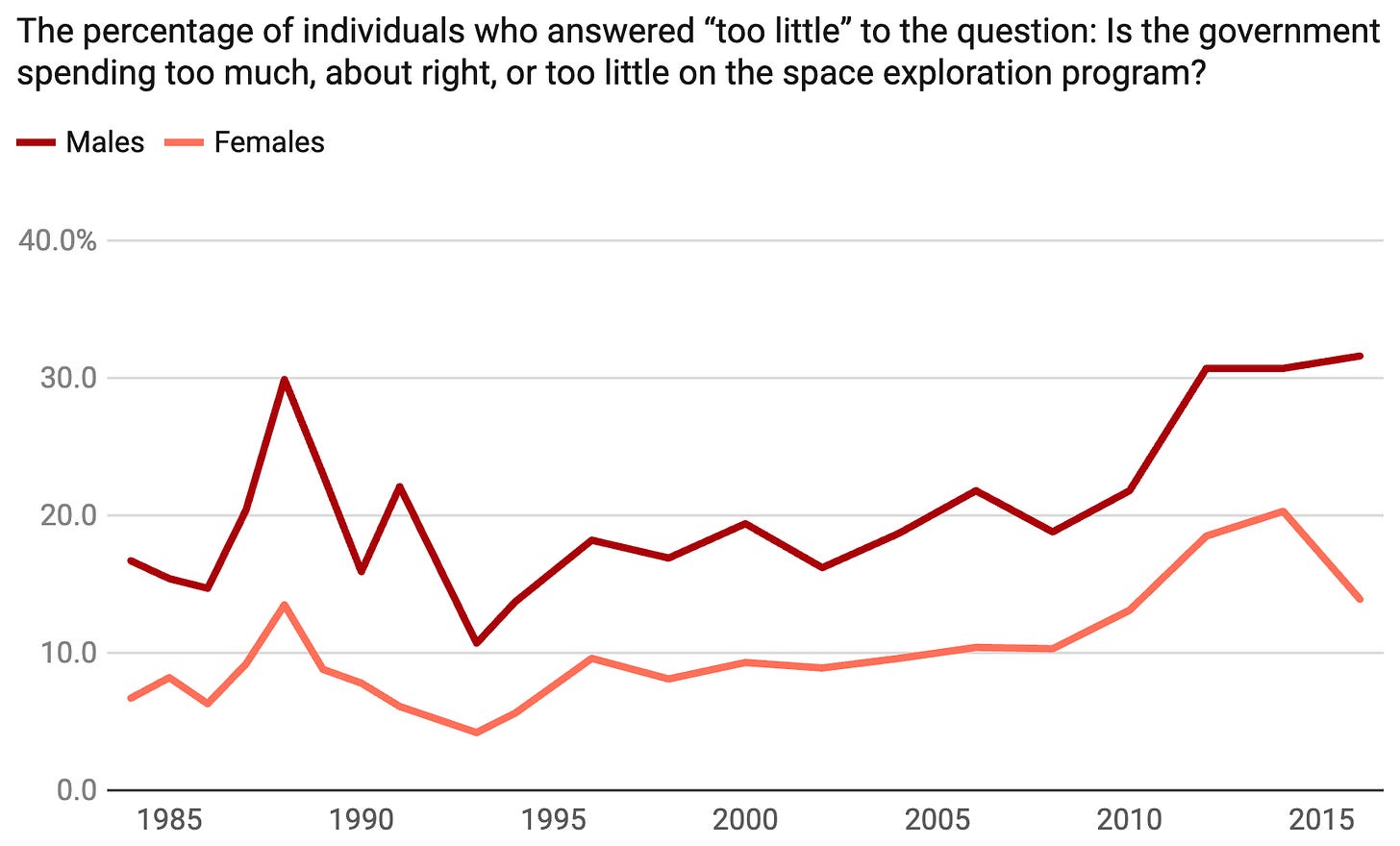 For example, the ur-symbol of progress in the second half of the 20th century was space exploration. For as far back as there is data, men have been much more likely to support increasing government funding for space exploration, usually around twice as much.