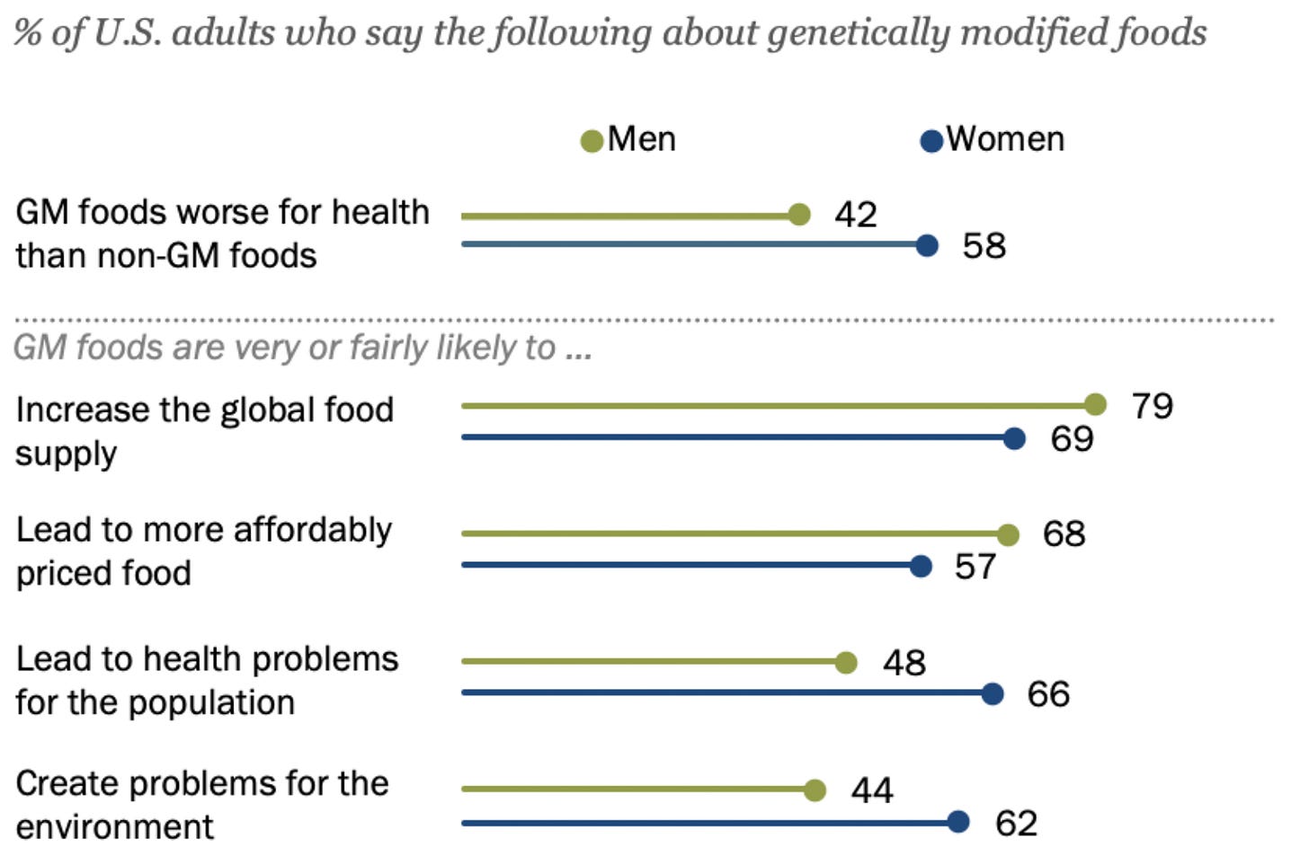As you would expect from their technophilia, Progress Studies is broadly in favor of transgenic crops (GMOs), such as golden rice or roundup-resistant corn, given their potential to continue rapid 20th century progress in agriculture. GMOs don’t get as much attention as they used to, but women are 16 points more likely to believe they are worse for health than men.