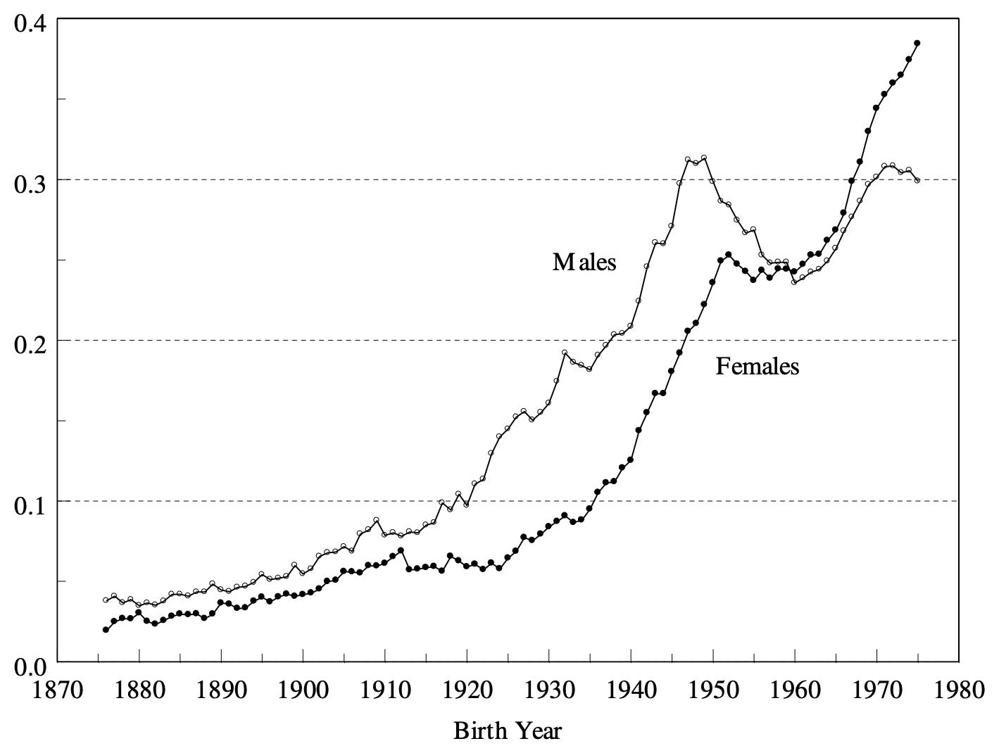 This closely matches the picture for college graduation rates (note that the x-axis is cohort birth year in the chart below).