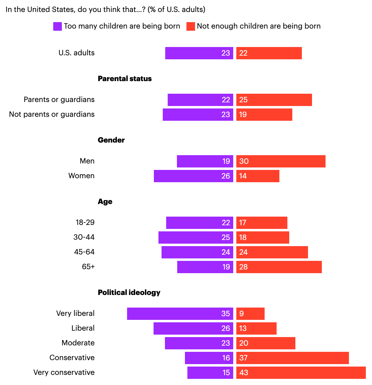 Progress Studies is pronatalist, on the grounds that the purpose of progress is to benefit people (there need to be people to benefit), and that more people means more agglomeration effects, more economies of scale, longer learning curves, more opportunities for specialization, more competition and more potential innovators.5 Once again, women are more likely to believe too many children are being born than men (26 to 19) and are less likely to believe not enough children are being born (14 to 30).