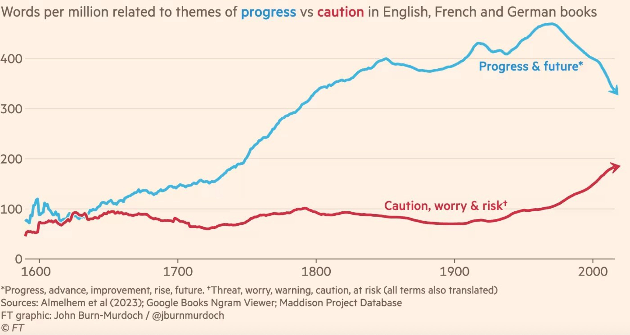 He is right. This change is quantifiable. Books written in English, French and German, the three major languages of the modern West, showed a continuous rise in the number of terms relating to progress and the future from 1600 to around 1970, when things suddenly took a turn for the worse.