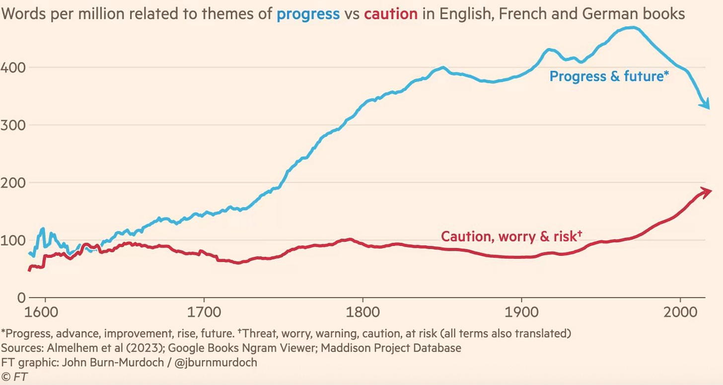 Progress Studies is not solely concerned with objective material indicators of slowdown. Culture matters too. In his 2021 essay, ‘We need a new philosophy of progress’, Jason Crawford wrote: