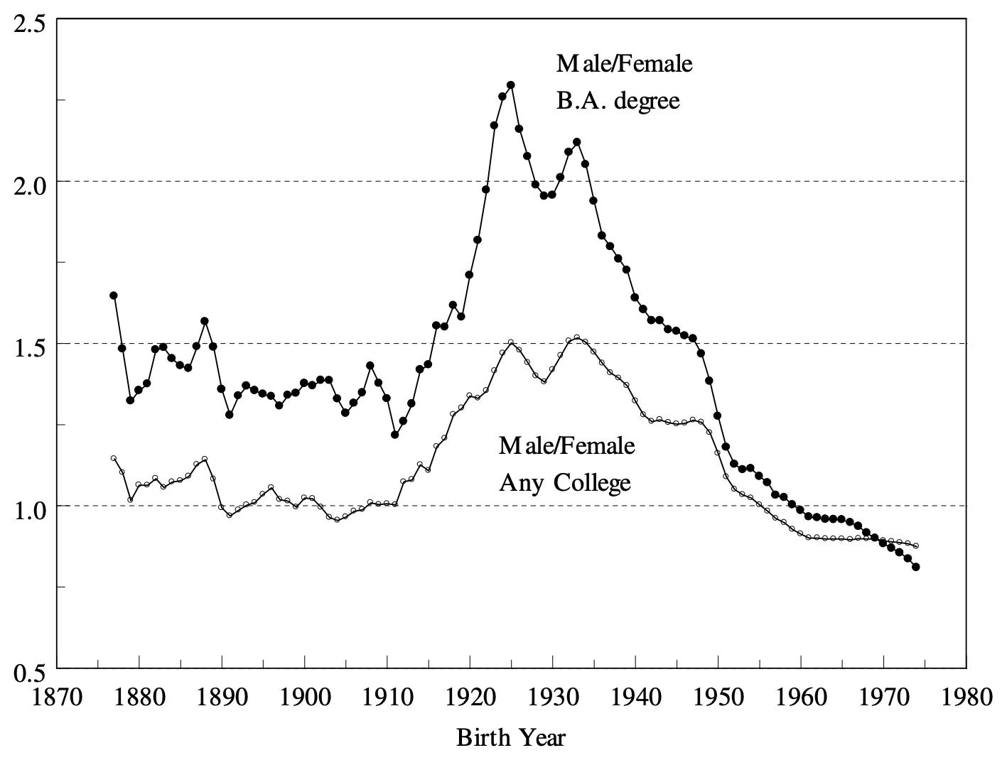 If women are psychologically more predisposed to (small-c) conservativism than men and hence opposed to progress, we might expect female cultural dominance to lead to the pattern seen in the text corpuses above. Does the timing work? Yes. Since 1970, women have gone from present-but-marginal in prestige cultural institutions to approximate parity with men.
