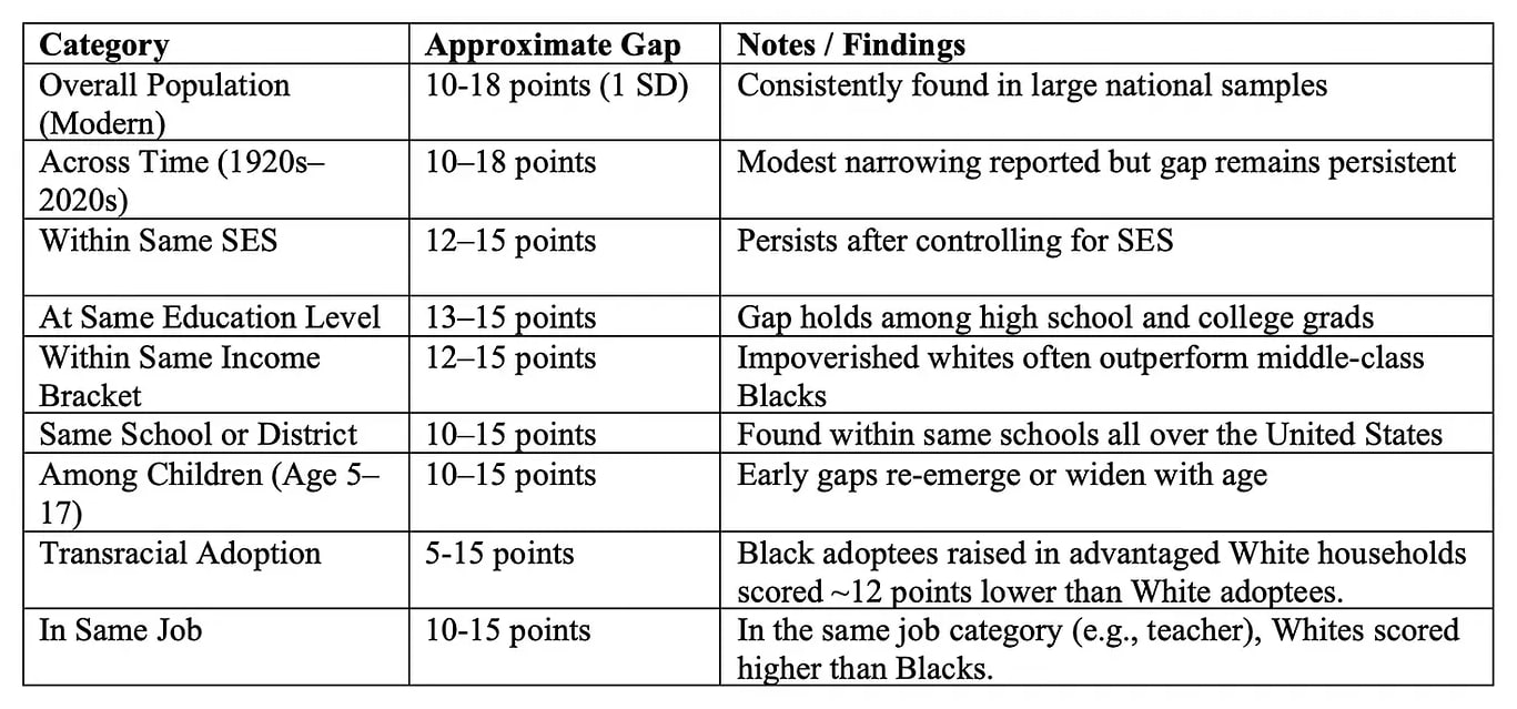 For the debate about race and IQ is not about the existence of a significant gap between blacks and whites, which is found in every data set and accepted by mainstream textbooks on the topic. The debate is only about the causes. Thus the typical slander that race and IQ is “pseudoscience” is irrelevant here. That there are large disparities in cognitive ability among races is an undisputed truth among relevant experts.