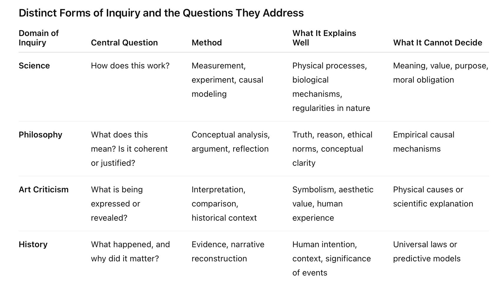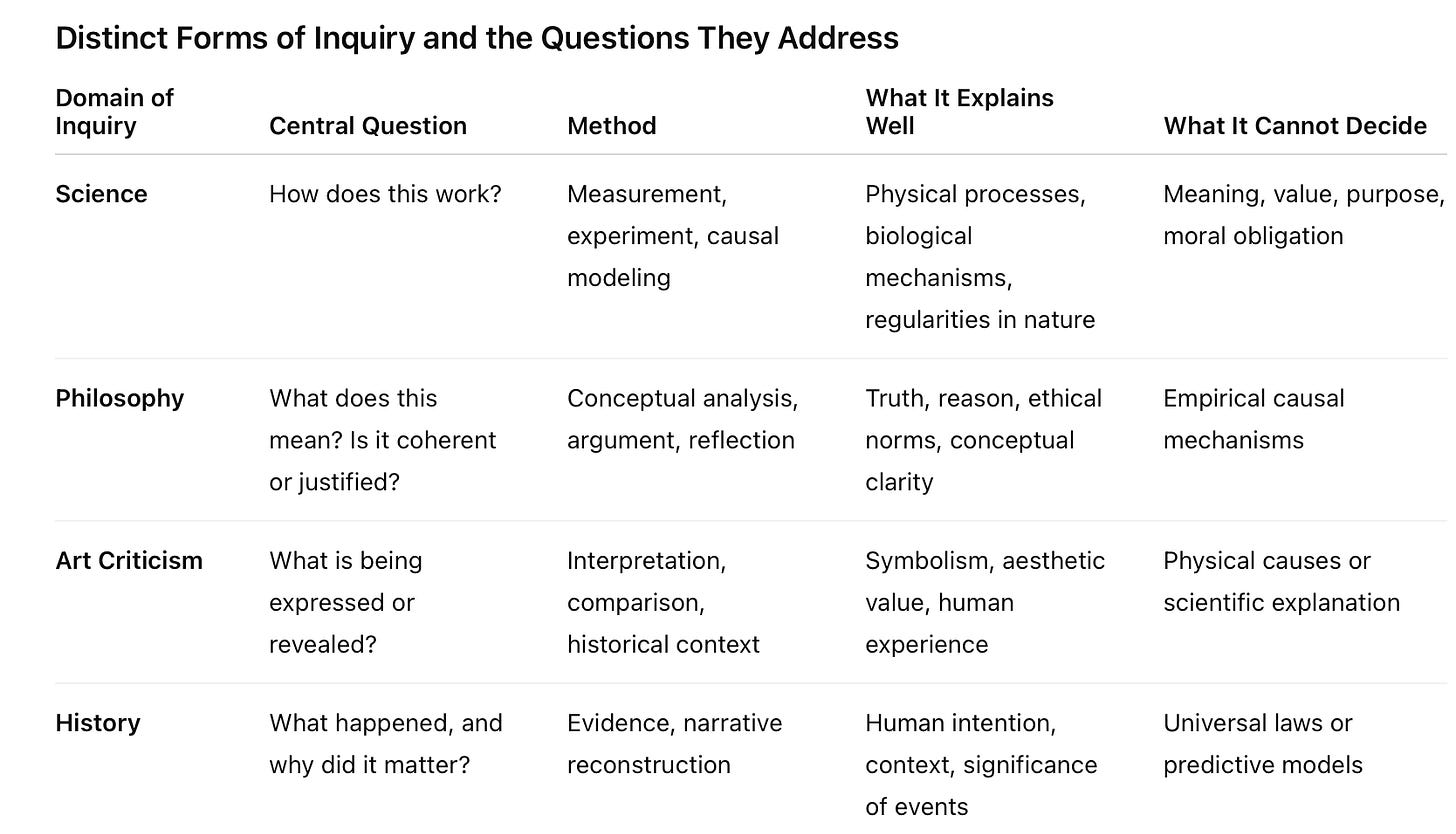 A father who supports his daughter, an artist who crafts a novel, or a citizen who struggles for justice is not mistaken to think his life meaningful simply because such meaning is not measurable under a microscope. These activities belong to a different domain of understanding, one concerned with significance, value, and obligation, and they are best approached through philosophy and art rather than through physics or chemistry.