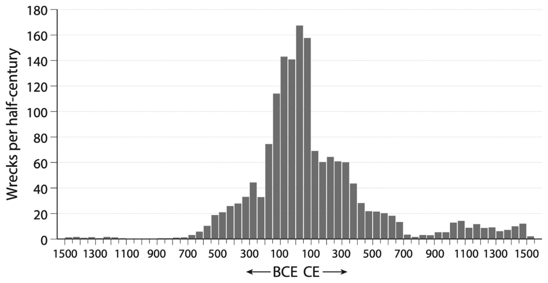 Why did the North Sea overtake the Mediterranean in international trade? Certainly, the latter region was adversely affected by the Arab conquests of the Middle East and North Africa. But the economic decline began much earlier. Shipwrecks on the bottom of the Mediterranean have been dated overwhelmingly to the time between the first century BC and the first century AD. Silver mining in Spain and Cyprus likewise fell sharply after the first century AD, as shown by lead contamination of Greenland’s ice sheet (Terpstra, 2019).