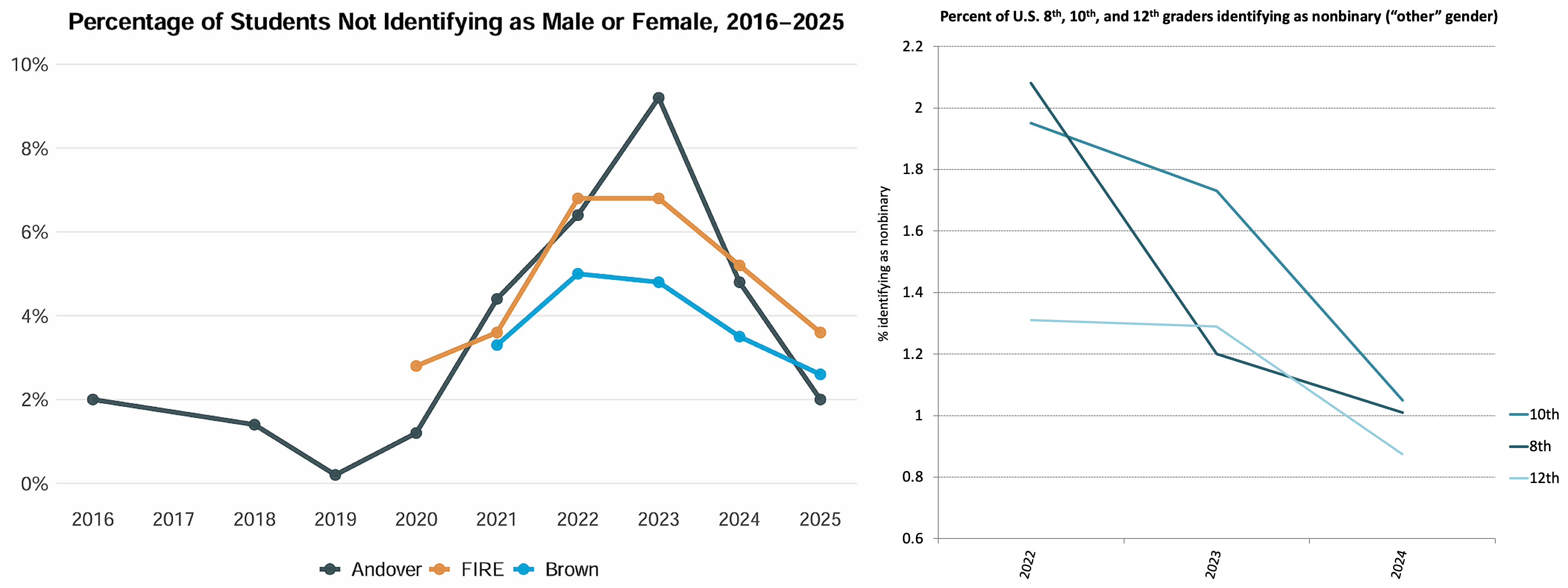 Kaufmann argues that the decline in transgender and “non-binary” identification is not fully explained by changes in mental health or political ideology (although those factors play a role). The pattern appears across red states and blue states, liberal and conservative students, and elite and non-elite institutions. From a signalling-theoretic point of view, this is what we would expect from a shift in the value of a signal rather than in the underlying distribution of underlying traits or intentions. As Kaufmann notes, the change in gender identification “seems to largely be an independent youth fashion that operates on a plane that is separate from politics and mental health”.