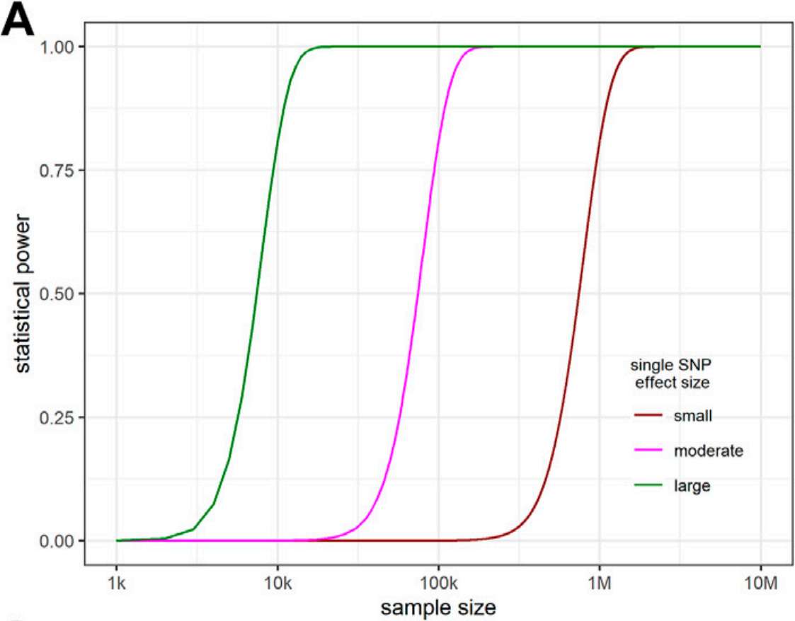GWAS studies examine one type of genetic variability, Single Nucleotide Polymorphisms (or SNPs), and they typically record SNPs at 20,000 locations out of 3 billion nucleotides, analysing them in a sample of 10,000 to 100,000 genomes. For a discussion of the statistical power of GWAS studies I refer to the 2022 paper by Tian Wu and colleagues. As the authors confirm, "The statistical power for an individual SNP is determined by its effect size, the sample size, and the desired significance level. In a random sample of size n, the test statistic for the association between a quantitative phenotype and a SNP is β sqrt(n)", where β is the effect size. Making a range of assumptions, they develop a model leading to the following plot: